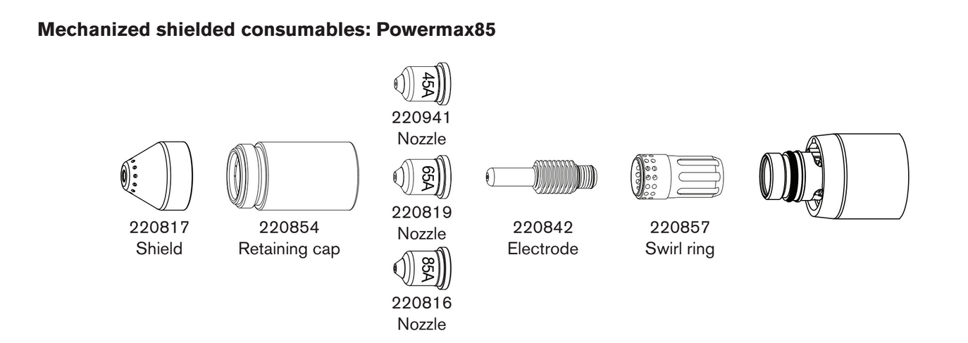 The nozzles usually have the current rating inscribed on them. If there is no inscription, assume a cone-shaped nozzle uses 45 amps.