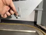 The latches holding the hopper hatches closed are supported by a magnetic brace helping hold the latch in place. Slide the brace out of the way before opening the latch. Open part way to allow media to begin to flow, then open the rest of the way. Always replace magnetic braces to support the latch after closing.